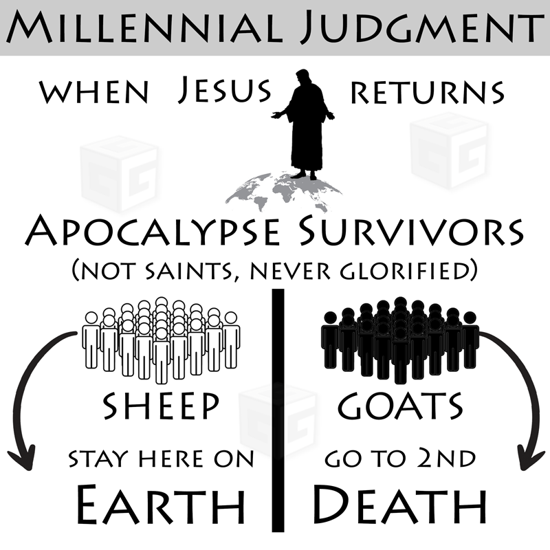 We know that this is after the Lord has taken His seat on the throne of Earth in Jerusalem. We also know from many passages in scripture that the previous seven-and-a-half years have seen the tribulation and God’s wrath (two distinct but sequential events). So, it’s very easy to see that these sheep and goats are survivors of the apocalyptic events that just preceded this judgment (see Matthew 24). These are not glorified people, but unglorified. And since glorification comes through faith, these are not believers—not one of them, whether a sheep or a goat. These, then, are mortal humans—the few survivors of the horrific times that just ended for them. “Throughout the earth the story is the same—only a remnant is left, like the stray olives left on the tree or the few grapes left on the vine after harvest.”(Isaiah 24:13, NLT)