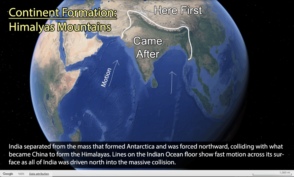 • India’s Separation from Antarctica – The surging forces carried what is now India from Antarctica, slamming it into the southern edge of Asia, creating the Himalayan mountain range.
