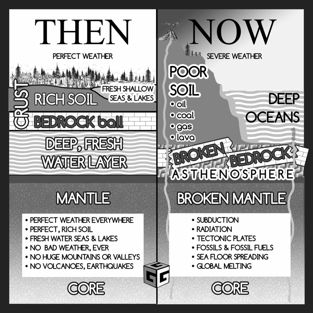 The Bedrock Layer was quickly lost, as Tectonic Plates were born from its ruin. In less than an hour, globally, it fell in pieces—now called plates— through the scalding watery depths and found its way to the Mantle that had just suffered its own demise in the same explosions. You see, when the chain reaction of blasts burst forth, they went in all directions—as most explosions do—multiplying themselves all around the planet’s inner spaces. Not only was the Bedrock container blown apart, but the Mantle was blown inward upon itself. This shattered the Mantle’s once perfect surface into a cracked ball, exuding the bloody lava onto its once smooth and hard face. It was a fractured mess of mush and falling fragments, sinking deep into the fiery depths of its heart and soul. Lava was going wild. The Water Layer was no more. The Bedrock and Mantle together were decimated beyond hope. As the explosions continued, the entire structure of the Pre-Flood Earth was lost forever.