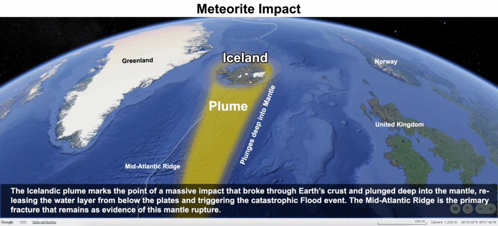 Key Points:The Flood began with fire, force, and fury, not just rain.A massive meteorite impact triggered a global catastrophe.The impact site (now Iceland) became the epicenter of destruction.The force of the impact pierced the thin Pre-Flood Crust, exposing the sealed Water Layer for the first time in 1,656 years.The Mantle released immense lava pressure, fueling further devastation.The meteorite struck with incomparable velocity, burning through atmospheric layers and hitting with pure kinetic wrath.The Icelandic Plume is a geological scar, evidence of the catastrophic rupture.Unlike other impact sites, Iceland is not a typical crater because it struck a Crust resting on a Water Layer, allowing it to punch through instead of leaving a traditional depression.