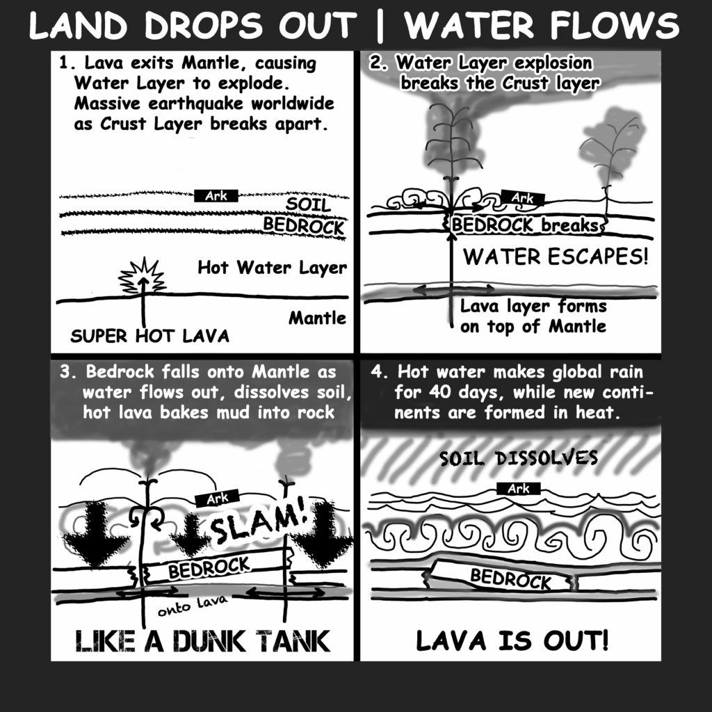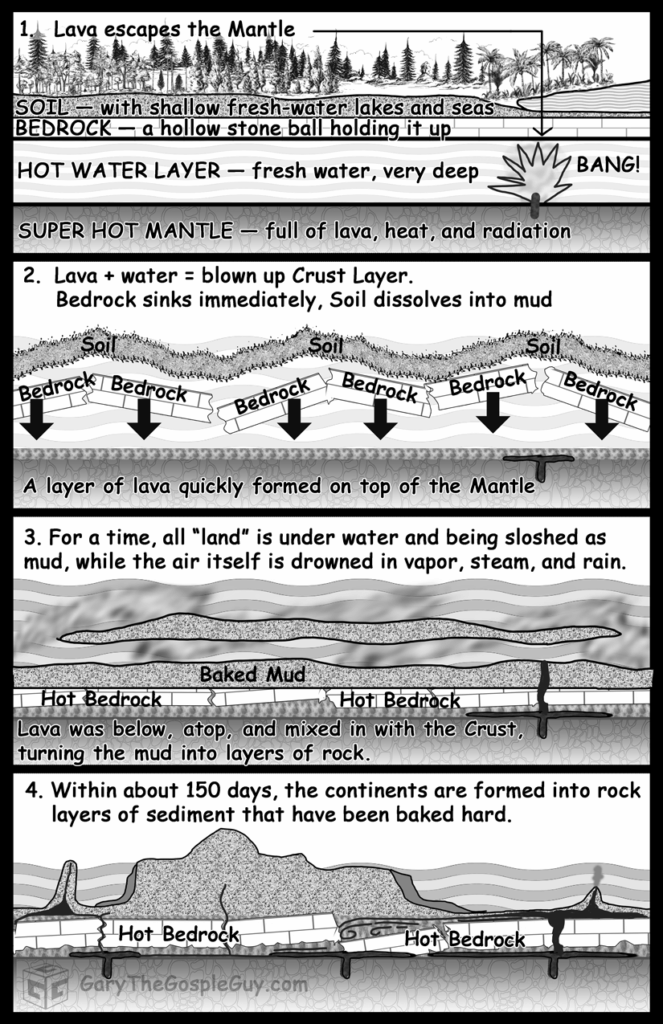 2. Separation of Mega Mud Globs into Continent Shapes – The force of the water propelled massive chunks of mud and lava across the planet, rapidly forming the foundational structures of the post-Flood continents. The continents and islands formed as lava provided a hardened foundation for the mud layers to settle on top of. All islands and continents were formed in situ—no spreading tectonics as widely assumed. Just soft mud riding on soft, hot lava. Being pushed around by water jets from below.
